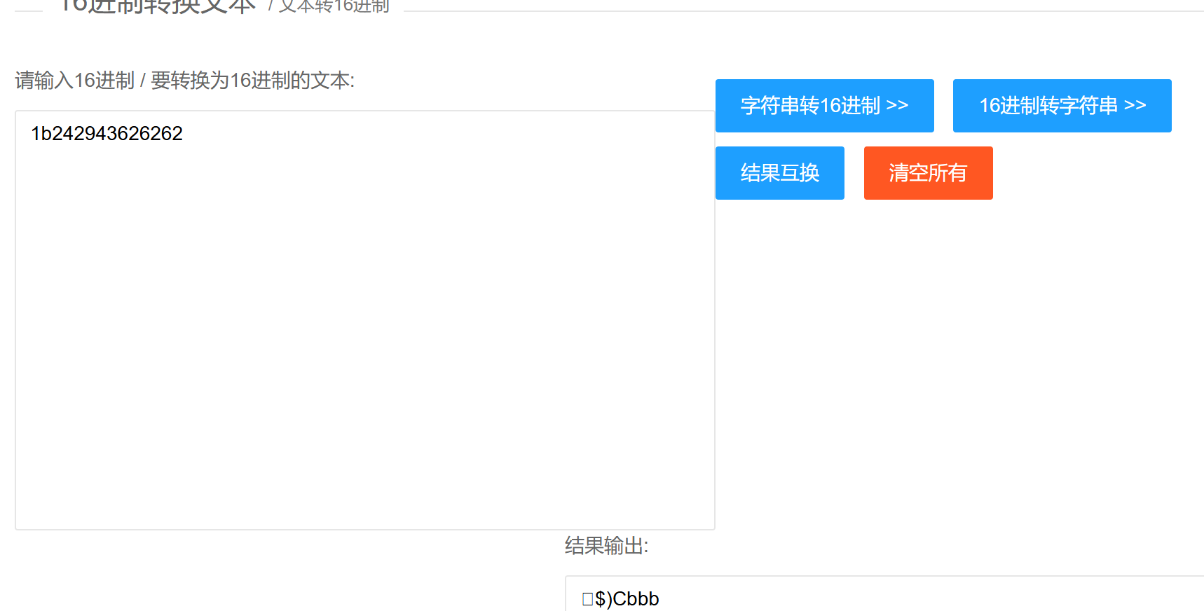 经过从UTF-8->CSISO2022KR后,bbb变成七个字节,但是只显示了三个b,因为剩下还有几个不可见字符,我们把下面的十六进制转换为文本16进制转换