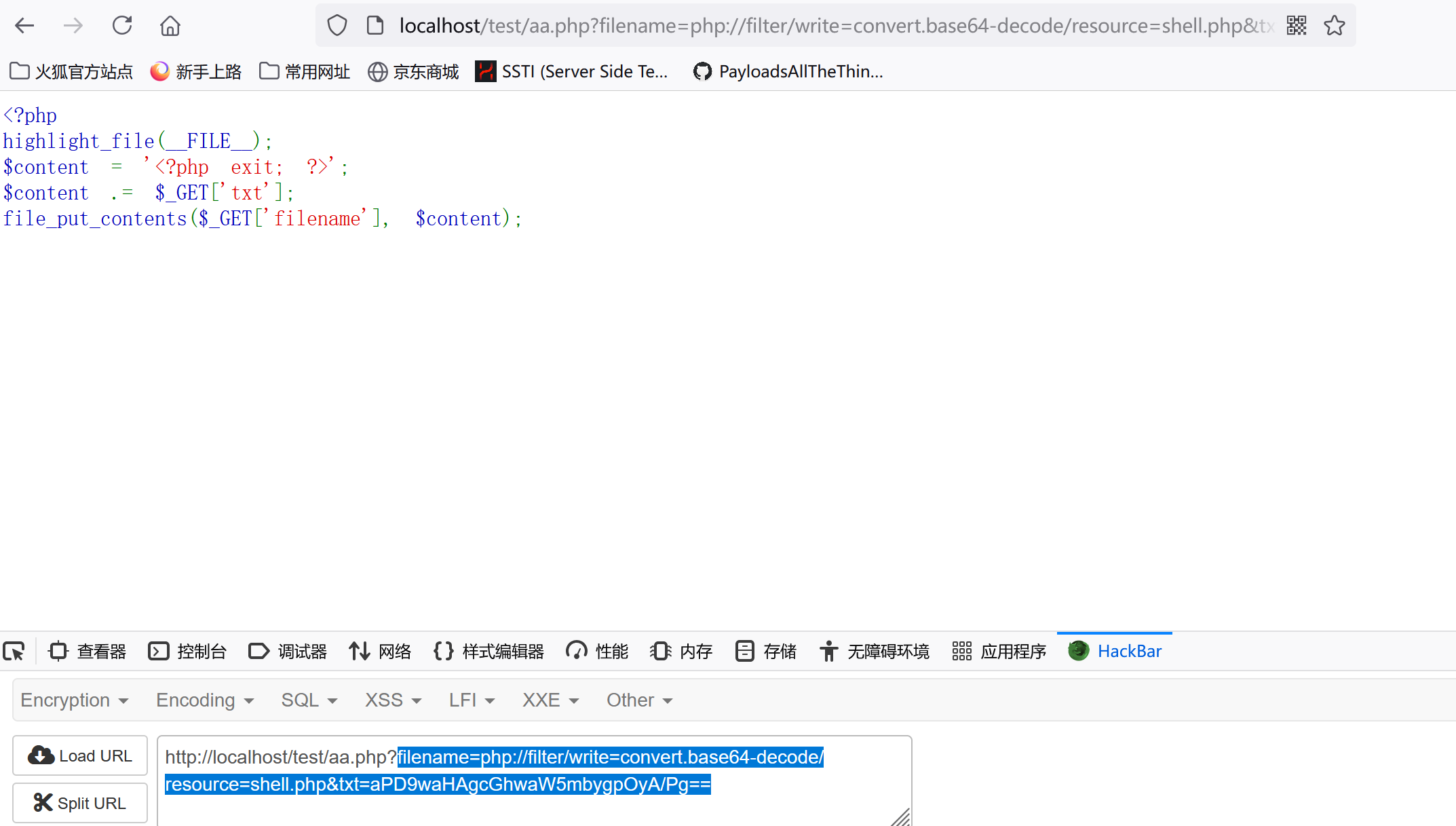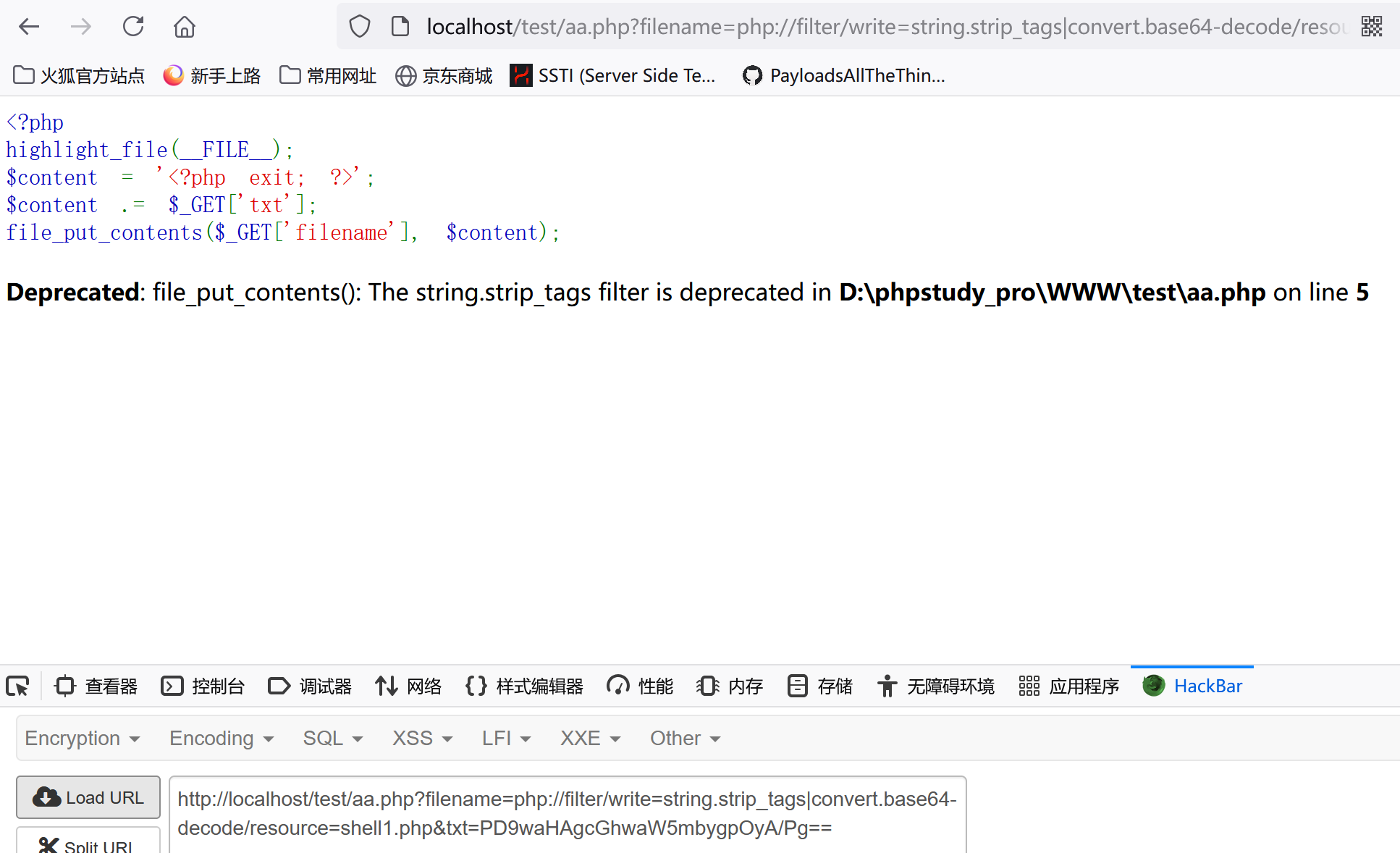 还好php://filter允许使用多个过滤器,我们可以先将webshell用base64编码。在调用完成strip_tags后再进行base64-decode。”死亡exit”在第一步被去除,webshell在第二步被还原。